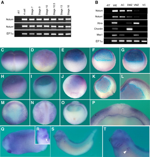 Larger Image Figure 4. Notum Expression Patterns during Xenopus Embryogenesis (A and B) RT-PCR revealed that Notum is maternally and zygotically expressed throughout Xenopus embryogenesis (A), and is enriched animally and dorsally at stage 10.5; animal caps, AC; dorsal marginal zone, DMZ; ventral marginal zone, VMZ; vegetal caps, VC; a pan-mesodermal marker, Xbra; a dorsal marker, Chordin; an animal and ventral marker, Msx1. (CâT) Whole mount in situ hybridization for Notum/Notumâ expression, showing lateral view at 4-cell and stage 6.5 (C and D); lateral and bisected view at stage 8.5 (E and F); bisected view at stage 9.5 (G); lateral and bisected view at stage 10.5, with dorsal on right (H and I); dorsal and bisected view at the stage 11 (J and K); with an enlarged anterior view showing stronger expression anteriorly (L); dorso-anterior (M); dorsal (N, anterior on top); and cross-section (O, dorsal on top; and P, an enlarged view) at stage 15; lateral view at the tail bud stage (Q); with an enlarged anterior view indicating expression in the cement gland (R, arrow); lateral view at the early tadpole stage (S); and with an enlarged view indicating expression in the pronephros region (T, arrowhead). The blue color at the blastocoel surface in bisections was non-specific. See also Figure S3. Image published in: Zhang X et al. (2015) Copyright © 2015. Image reproduced with permission of the Publisher, Elsevier B. V.