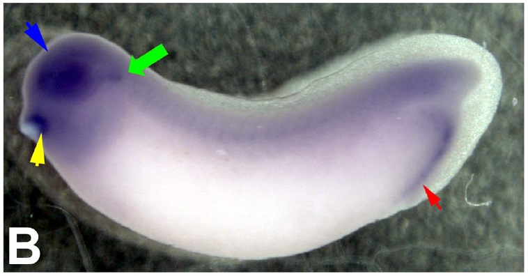 Larger Image kcne1 (potassium channel, voltage gated subfamily E regulatory beta subunit 1) gene expression in Xenopus laevis embryo, assayed via in situ hybridization, NF stage 28, lateral view, anterior left, dorsal up. This image is extracted from figure published in: Morokuma J et al. (2008), Image published in: Morokuma J et al. (2008) Copyright © 2008. Image reproduced with permission of the Publisher and the copyright holder. This is an Open Access article distributed under the terms of the Creative Commons Attribution License.