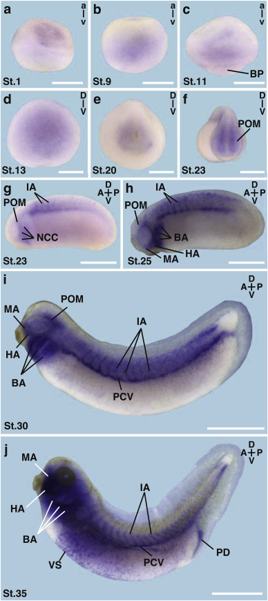 Larger Image Fig. 4. Spatial expression pattern of adgra2 mRNA during Xenopus laevis embryogenesis. Spatial expression pattern of adgra2 is visualized by WMISH. Embryonic stages are indicated in each panel. a-c. Lateral views with animal to the top. d-f. Anterior views with dorsal to the top. g-j. Lateral views with anterior to the left. f, g. The first tissue specific adgra2 expression starts at stage 23 in the periocular mesenchyme (POM), the migrating neural crest cells (NCC) and the intersomitic arteries (IA). h. At stage 25, adgra2 is expressed in the periocular mesenchyme (POM), the migrating cranial neural crest cells (NCC) and the intersomitic arteries (IA). i. At stage 30, adgra2 was detected in the branchial (BA), hyoidal (HA) and mandibular (MA) arches, the periocular mesenchyme (POM), the intersomitic arteries (IA) and the posterior cardinal vein (PCV). j. At stage 35 adrga2 transcripts were detected in the pharyngeal arches (BA, HA and MA), in the intersomitic arteries (IA), the vascular system (VS), the posterior cardinal vein (PCV) and the proctodeum (PD). a, animal; A, anterior; BA, branchial arches; BP, blastoporus; D, dorsal; HA, hyoidal arch; IA, intersomitic arteries; MA, mandibular arch; NCC, neural crest cells; P, posterior; PCV, posterior cardinal vein; PD, proctodeum; POM, periocular mesenchyme; v, vegetal; V, ventral. Scale bars: 500â¯Î¼m (aâh): 1â¯mm (i, j). Image published in: Seigfried FA et al. (2018) Copyright © 2018. Image reproduced with permission of the Publisher, Elsevier B. V.