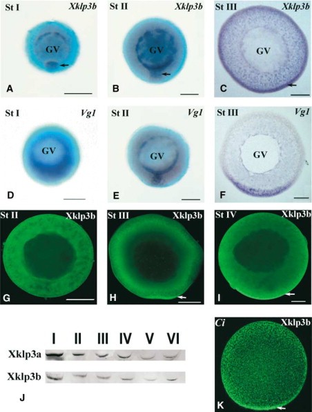 Larger Image Figure 1. Expression and Localization of Heterotrimeric Kinesin II mRNA and Protein during Oogenesis(AâF) Whole mount in situ hybridization to endogenous Xklp3b (AâC) and Vg1 mRNA (DâF) in stage I (A and D), stage II (B and E), and stage III (C and F) oocytes. Arrows in (A)â(C) depict slight enrichment of Xklp3b mRNA in the mitochondrial cloud, wedge region, and vegetal cortex, respectively. GV is the germinal vesicle. The vegetal pole is oriented down in all images, and (C) and (F) are sectioned so that the cortex is visible. (GâI and K) Confocal images of Xklp3b-labeled Xenopus stage II (G), stage III (H), and stage IV (I) oocytes and an egg from Ciona intestinalis (K). Arrows in (H), (I), and (K) indicate enrichment of kinesin II at the vegetal cortex. (J) Western blots of whole-cell extracts prepared from stage IâVI oocytes via Xklp3a- and Xklp3b-specific antibodies. The scale bar represents 100 μm. Image published in: Betley JN et al. (2004) Copyright © 2004. Image reproduced with permission of the Publisher, Elsevier B. V.