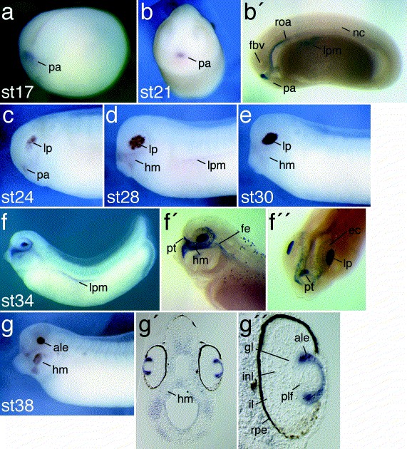 Larger Image Fig. 2. Expression of Xpitx3 during Xenopus development. Whole-mount in situ hybridization was performed using Xpitx3 antisense RNA and staged Xenopus embryos. NieuwkoopâFaber stages of embryogenesis are indicated. (a,bâ²,c,d,e,f,fâ²,g) Lateral view; (b) anterior view of the embryo; to improve resolution cleared embryos in lateral view are shown in (bâ²,fâ²,fâ²). (gâ²,gâ²) show frontal sections of the embryo shown in (g). In (fâ²) the embryo of (f) is shown in an anterior view. ale, anterior lens epithel; fbv, forebrain ventricle; ec, eye cup; fe, foregut endoderm; gl, ganglion layer; hm, head mesenchyme; il, inner layer; inl, inner nuclear layer; lp, lens placode; lpm, lateral plate mesoderm; lv, lens vesicle; nc, notochord; pa, pituitary Anlage; pt, pituitary; rpe, retinal pigment epithel; pfl, primary lens fibres; roa, roof of archenteron. Image published in: Pommereit D et al. (2001) Copyright © 2001. Image reproduced with permission of the Publisher, Elsevier B. V.