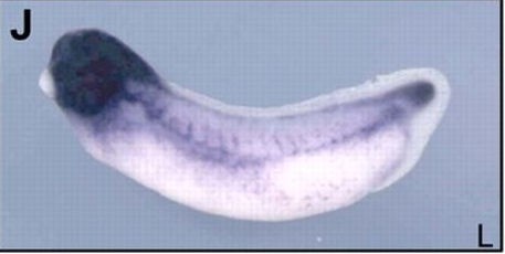 | Larger Image mex3b (mex-3 RNA binding family member B ) gene expression in Xenopus laevis embryo, assayed via in situ hybridization, NF stage 29, dorsal view, anterior up. This image is extracted from figure published in: Takada H et al. (2009), Image published in: Takada H et al. (2009) Copyright © 2009. Image reproduced with permission of the Publisher and the copyright holder. This is an Open Access article distributed under the terms of the Creative Commons Attribution License.