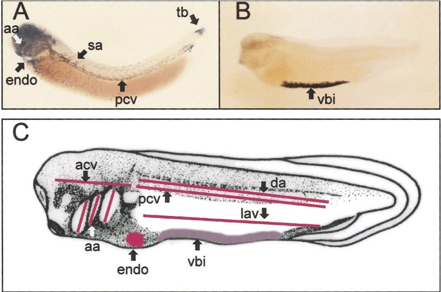 | Larger Image FIG. 2. Identification of vascular structures and ventral blood islands. Whole-mount in situ hybridization was performed on hatching- stage embryos (stage 33/34) using (A) X-msr to identify vascular tissue and (B) Beta-globin to identify the ventral blood islands. (C) Schematic diagram indicating the location of structures examined in this study. aa, aortic arches; acv, anterior cardinal vein; da, dorsal aorta; endo, endocardium; lav, lateral abdominal vein; pcv; posterior cardinal vein; sa, somitic arteries; tb, tailbud; vbi, ventral blood islands. Image published in: Mills KR et al. (1999) Copyright © 1999. Image reproduced with permission of the Publisher, Elsevier B. V.