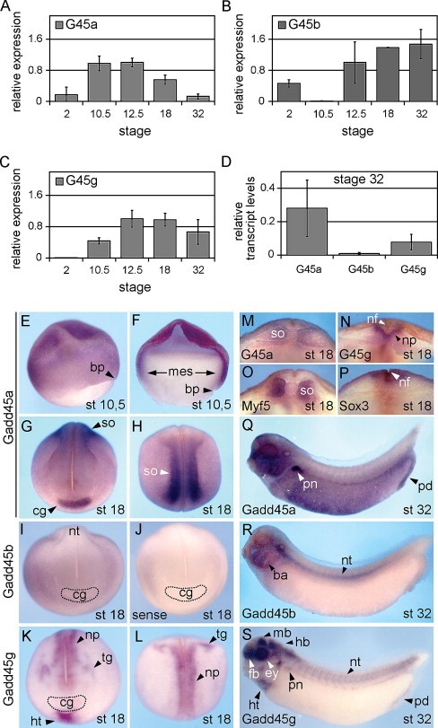 Larger Image Fig. 2. Differential expression of Gadd45a, Gadd45b and Gadd45g during Xenopus embryogenesis. (AâC) qPCR analyses showing the mean concentration normalized to GAPDH of Xenopus Gadd45a (A), Gadd45b (B) and Gadd45g (C). (D) Quantification of relative transcript levels of Xenopus Gadd45a, Gadd45b and Gadd45g in tadpole stage (st. 32) embryos. (EâS) Whole mount in situ hybridization expression analyses. (EâH) Gadd45a expression in lateral view of whole (E) and sagitally halved (F) gastrula stage (st. 10.5) embryos, dorsal is right. (G) Anterior and (H) dorsal view of late neurula stage (st. 18) embryo. (I and J) Gadd45b expression in anterior view of stage 18 embryo using antisense (I) and sense control probe (J). (K and L) Gadd45g expression in anterior view (K) and dorsal view (L) of stage 18 embryo. (MâP) Expression analysis of stage 18 embryos cut transversally with the probes indicated. (QâS) Lateral view of tadpole stage (st. 32) embryos hybridized with probes for Gadd45a (Q), Gadd45b (R) and Gadd45g (S). The cement glands are outlined by dashed lines in (IâK). Key: (ba) branchial arches, (bp) blastopore, (cg) cement gland, (ey) eye, (fb) forebrain, (hb) hindbrain, (ht) heart field, (mes) mesoderm, (mb) midbrain, (nf) neural fold, (np) primary neuron precursors, (nt) neural tube, (pd) proctodeum, (pn) pronephros, (so) somites, (tg) trigeminal placode. Image published in: Kaufmann LT and Niehrs C (2011) Copyright © 2011. Image reproduced with permission of the Publisher, Elsevier B. V.