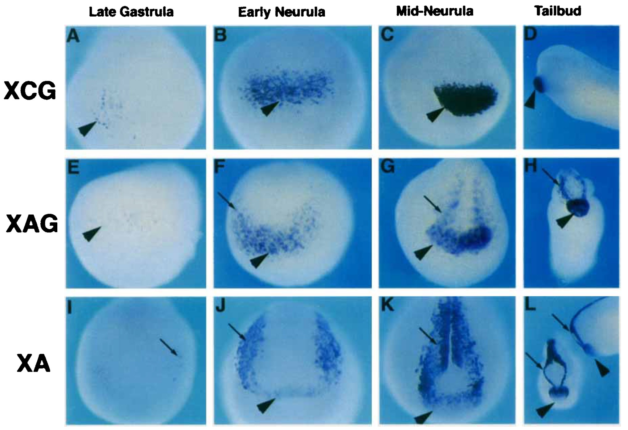 Larger Image Fig. 2. Developmental time course of three cement gland markers in Xenopus. In situ hybridization analysis using digoxygenin labeled antisense probes hybridized to a developmental series of whole Xenopus embryos. XCG (A-D) and XAG (E-H) (Sive et al., 1989) transcripts are first detected at late gastrula, in dispersed cells within the outer layer of the dorsal ectoderm, just anterior to the presumptive neural plate (A, E). XCG is detected in presumptive cement gland cells only, whereas XAG is detected in cement gland cells (arrowheads) and more weakly in the adjacent, posterior hatching gland cells (arrows). XA transcripts (CL) (Sive et al., 1989) are initially detected at late gastrula stage in the hatching gland primordium (I), and then at early neurula stage, in the cells of the posterior cement gland (J). Refer to Cement Gland Anatomy: Morphology and Molecules in the text for discussion of these data. In situ hybridization method adapted from Harland (1991). Image published in: Sive H and Bradley L (1996) Copyright © 1996. Image reproduced with permission of the Publisher, John Wiley & Sons.