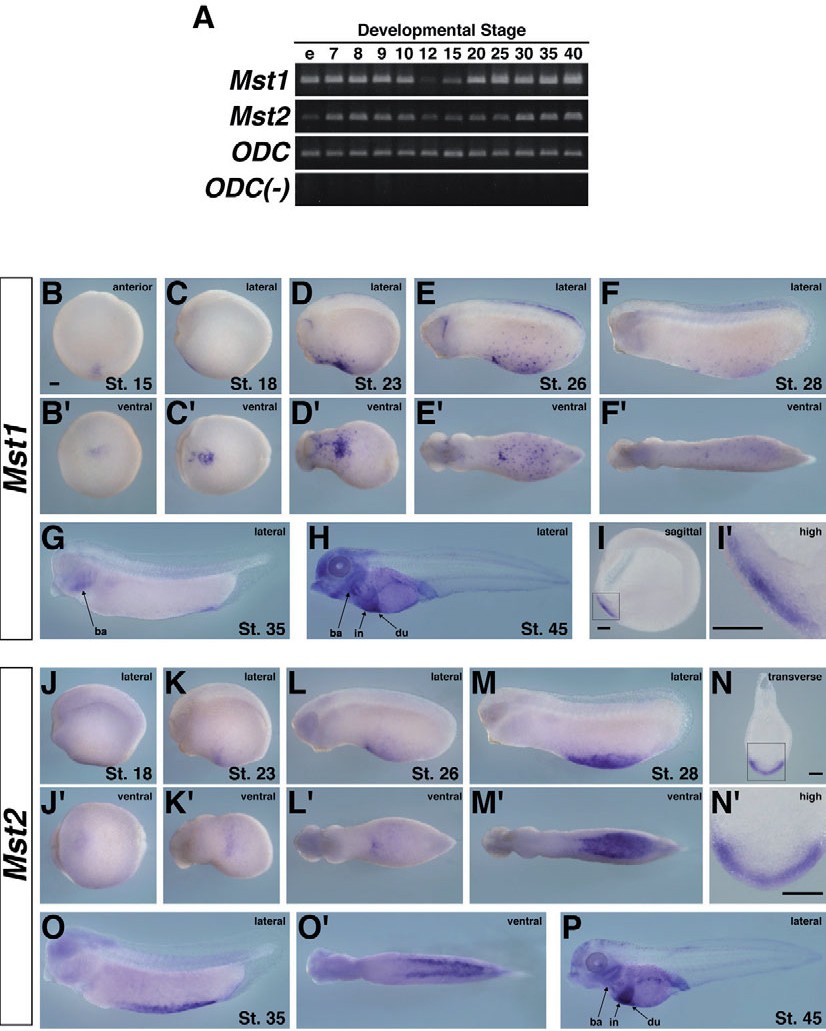 Larger Image Fig. 1. Expression pattern of Mst1 and Mst2 in Xenopus tropicalis development. (A) RT-PCR analysis revealed the temporal expression patterns of Mst1 and Mst2. RNA was extracted from Xenopus tropicalis embryos at the stages indicated above each lane. ODC were used as internal controls. ODC(-), RT-PCR without reverse transcriptase in ODC reaction. e, unfertilized egg. (B-P) Whole-mount in situ hybridization analysis of Mst1 and Mst2. (B-H) Localized expression pattern of Mst1. (B�) The anterior view corresponding to (B). (C�-F�) The ventral view corresponding to C-F. (I) Hemi-sectioning of a stage-18 embryo revealed detailed localization of Mst1 in the aVBI. (I�) High magnification view of the boxed region in (I). (J-M,O,P) Localized expression pattern of Mst2. (J�-M�,O�) The ventral view corresponding (J-M, P,O). (N) Transverse sectioning of a stage-28 embryo revealed detailed localization of Mst2 in the pVBI. (N�) High magnification view of the boxed region in (N). Scale bars, 100 +m. View direction is indicated in the upper right of each panel. Developmental stage is indicated in the lower right. Abbreviations: ba, branchial arch; du, duodenum; in, intestine. Image published in: Nejigane S et al. (2013) Copyright © 2013. Image reproduced with permission of the Publisher, University of the Basque Country Press.