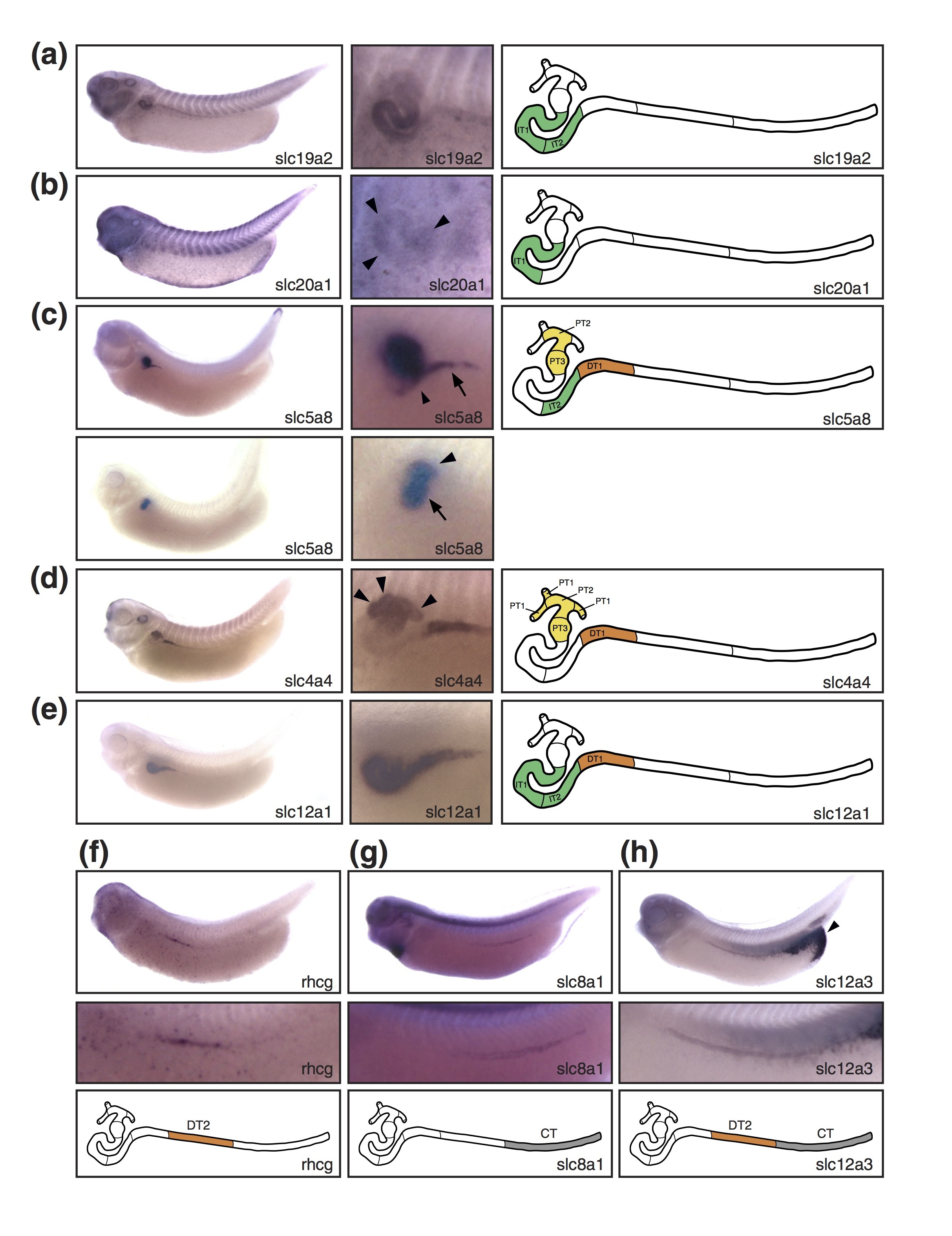 Larger Image Figure 4. Slc gene expression defines segmentation of the intermediate, distal, and connecting tubules. Stage 35/36 Xenopus embryos were stained for marker gene expression by whole-mount in situ hybridization. Lateral views of stained embryos are shown accompanied by enlargements of the pronephric region and a color-coded scheme of the nephron depicting the deduced segmental expression domains. (a) slc19a2: intermediate tubule. (b) slc20a1: intermediate tubule (IT)1 (arrowheads). (c) slc5a8: proximal tubule (PT)2, PT3, IT2, and distal tubule (DT)1. In the upper panel, the embryo was stained to reveal slc5a8 expression in IT2 (arrow) and DT1 (arrowhead). The embryo shown in the lower panel was stained shorter to demonstrate expression in PT2 (arrowhead) and PT3 (arrows). (d) slc4a4: proximal tubules, DT1. Arrowheads illustrate expression in PT1. (e) slc12a1: intermediate tubule, DT1. (f) rhcg/slc42a3: DT2. (g) slc8a1: connecting tubule (CT). (h) slc12a3: DT2, CT. Note that there is also strong slc12a3 expression in the cloaca (arrowhead). The localization of the expression domains for slc12a1 and slc12a3 has previously been reported [22]. They are shown here for comparative purposes. Image published in: Raciti D et al. (2008) Copyright © 2008 Raciti et al. Creative Commons Attribution license